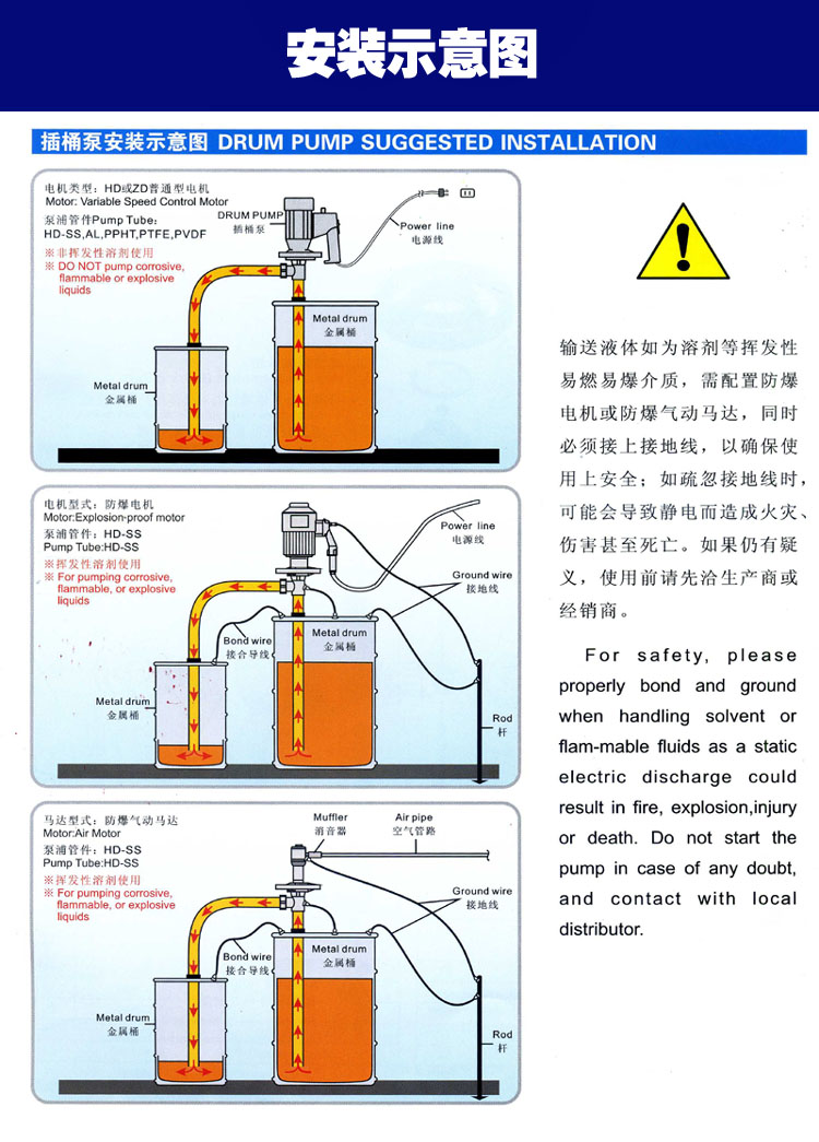 博生牌電動插桶泵(油桶泵)自主研制而成,各項技術(shù)指標均能達到樣機水平,并在樣機基礎(chǔ)上開發(fā)了不同使用場合不同抽吸液體的派生產(chǎn)品,該系列泵為輕便型管式軸流泵,具有效率高,使用、維護方便等特點。JK-3B-7RPP防爆型塑料油桶泵可以直接插入物料桶(大適用于符合GB/325-1991標準的鋼桶)中抽取桶中液體。可輸送各種油料、帶腐蝕性化學藥水、其他液體。根據(jù)材質(zhì),電機不同,型號可分為: JK-3、JK-3B、JK-3-3、JK-3-7、JK-3-9、JK-3B-7系列(編號為SB-1,SB-1-1,SB-2,SB-2-1,SB-3,SB-4,SB-5,SB-6,SB-7,SB-8,SB-10系列)鋁合金,不銹鋼或防爆型。我們備有詳細資料,歡迎索取。博生該系列泵可按防爆區(qū)域和非防爆區(qū)域選用,凡在防爆區(qū)域使用配置防爆型電機,這類電機分三種機組型號,當使用條件含各種易燃易爆混合時,應選用高組級。