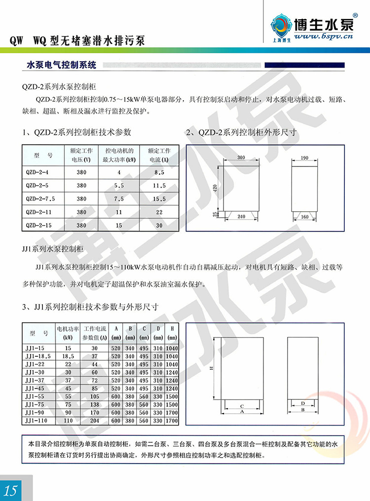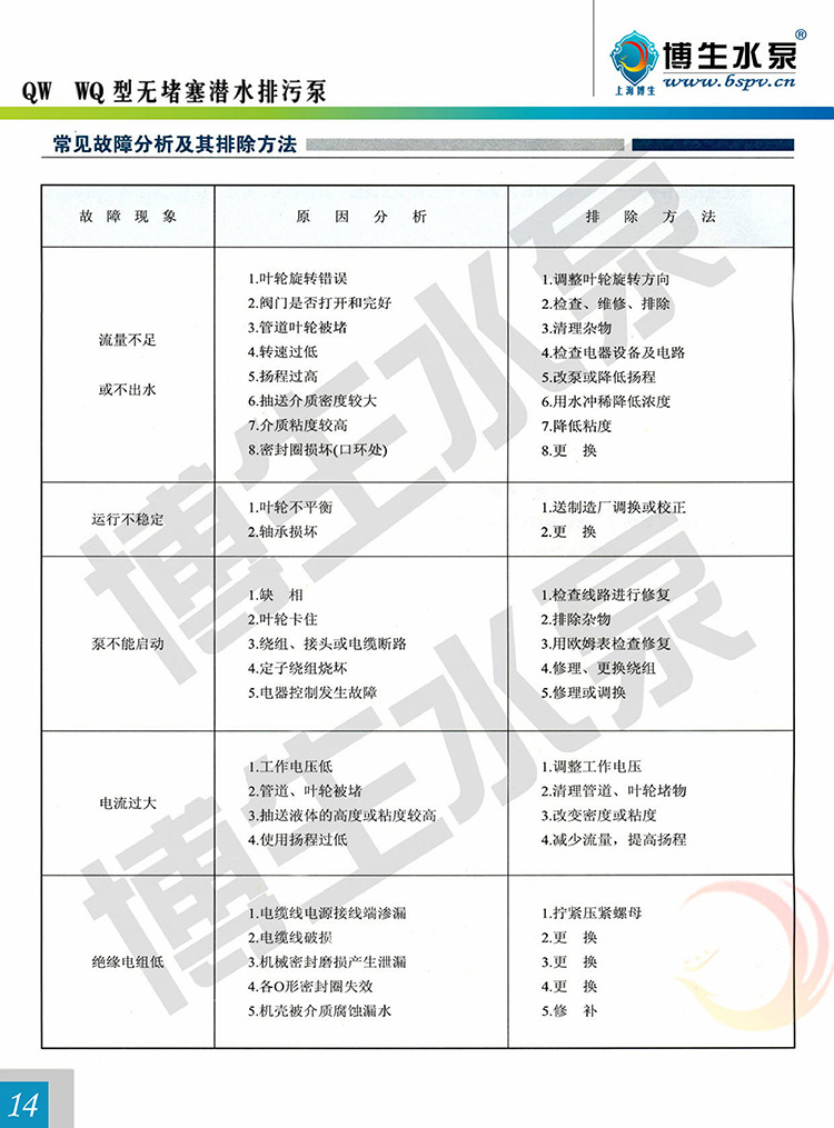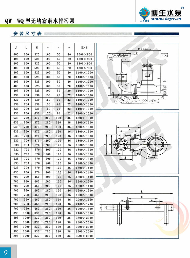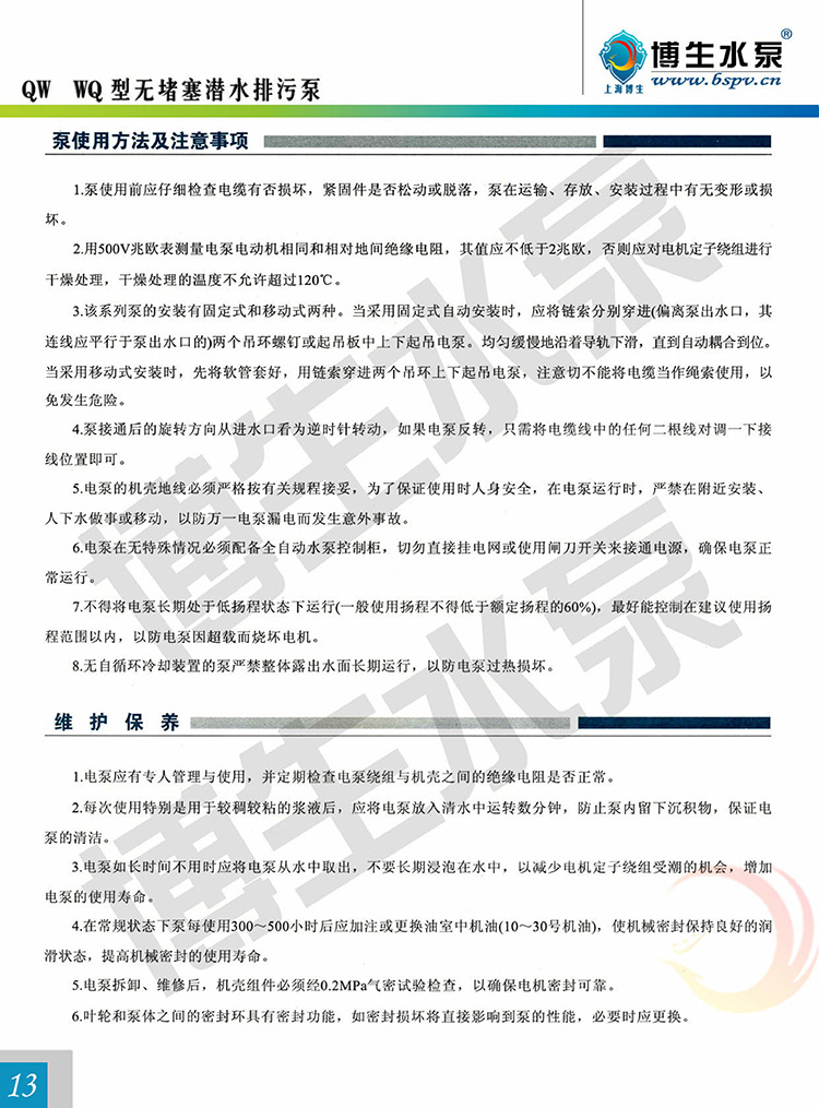 產(chǎn)品概述: 博生牌QW型無(wú)堵塞潛水排污泵,是引進(jìn)國(guó)外高效節(jié)能無(wú)堵塞排污泵,組織本單位技術(shù)力量研制而成,各項(xiàng)性能標(biāo)均達(dá)到或超過(guò)國(guó)內(nèi)外同類產(chǎn)品技術(shù),由于采用獨(dú)特的單通道葉輪,動(dòng)密封采用兩組特殊材料的硬質(zhì)合金機(jī)械密封裝置、電機(jī)用油室隔開(kāi),具有無(wú)堵塞、經(jīng)久耐用、型線準(zhǔn)確、使用修方便、效率高、節(jié)能顯著,是我國(guó)泵類新?lián)Q代的新產(chǎn)品,深受用戶歡迎。該泵有多種型號(hào)和不同的結(jié)構(gòu)形式可供選用。 QW型無(wú)堵塞潛水排污泵由電機(jī)與泵兩部分組成,二者通過(guò)油隔離室及機(jī)械密封組件隔開(kāi),屬機(jī)電一體化產(chǎn)品,電機(jī)與泵合用同一軸(轉(zhuǎn)子)整個(gè)水泵長(zhǎng)度短,結(jié)構(gòu)緊湊。配備多種保護(hù)裝置,使得泵運(yùn)行可靠,其主部件作用如下:信號(hào)線1:配備全保水泵控制柜,對(duì)泵實(shí)行全方位保護(hù),包括漏水,斷相、短路、過(guò)熱、電機(jī)過(guò)載等項(xiàng)目.電機(jī)定子8:采用B級(jí)或F級(jí)絕緣。漏水探頭11:該元件裝在油室內(nèi),當(dāng)機(jī)械密封損壞后,水進(jìn)入油室,探頭可發(fā)出信號(hào)由控制系統(tǒng)對(duì)泵實(shí)施保護(hù)。機(jī)械密封13:采用雙道串聯(lián)密封,選用新型硬質(zhì)耐腐碳化鎢材質(zhì),具有密封可靠、耐磨、壽命長(zhǎng)等特點(diǎn)。 葉輪17:葉輪采用單流道或雙道結(jié)構(gòu),具有很強(qiáng)的通過(guò)能力,能夠通過(guò)大的物料及纖維垃圾,減少堵塞、纏繞的故障。泵體15:與葉輪配用,使得泵具有高的效率。密封環(huán)18:裝在泵體口環(huán)處,當(dāng)葉輪因運(yùn)行而使口環(huán)處磨損,可換密封環(huán),以保證泵以佳效率運(yùn)行。